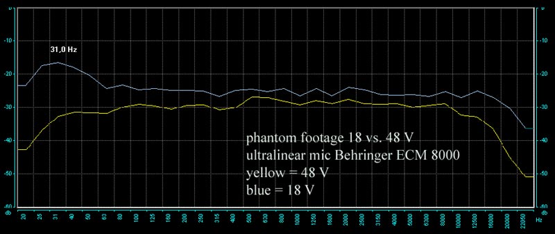 Here Analyser Pro 4.2.1 comes into the picture, because it offers the excellent opportunity to test what is really going on. We tested a beltfeed AKG B 18 with two 9 V batteries against a 48 V feed provided by our rack using the average function of Analyser Pro as described in this workshop. The mic is an ultralinear Behringer ECM 8000. The white noise is calibrated to our monitors by a Behringer Ultra Curve 8024.