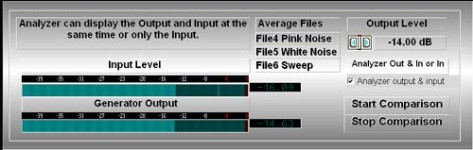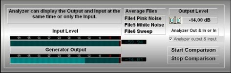 With "Start comparison" you can calibrate the input with the output. Press start comparison. Now you see the output level from the white noise in the Generator Output VU Meter. We have selected -