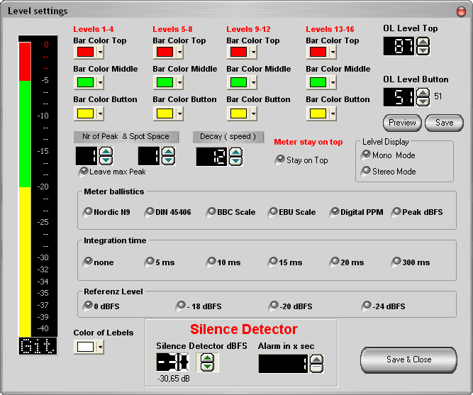 Here you can select your Meter ballistic, integration time and your referenz level. You also can change the colors and the outfit of the levels. Referenz level America = -