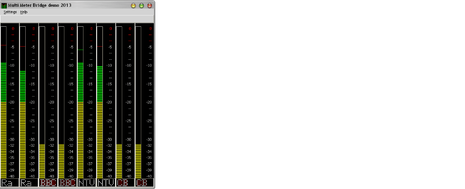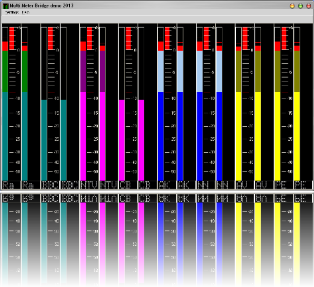 You can monitor 8 input channels, 16 input channels or 24 input channels in realtime. Choose between 5ms, 10ms, 15ms, 20ms and 300ms integration time. When you have more than 24 Input devices, you can open more instance from the program so that it is possible to view (monitor) more than 48 or 96 channels in realtime! In the comparison with a hardware 24 Channel Meter Bridge is the price of only 69$ simply unbeatable.