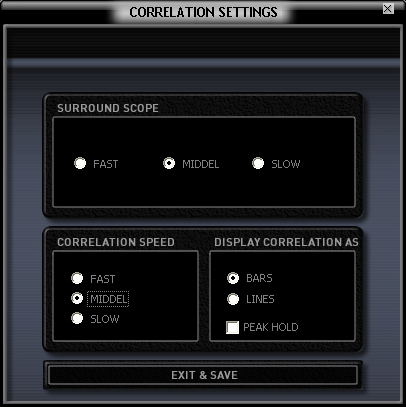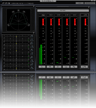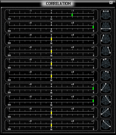 Especially the often very critical balance between the front and rear speakers is shown clearly and immediately here. However, this only refers to the loudness of the five channels to each other and not to their phase relation. The phase relation of a chosen pair of channels will be shown on a correlation display below.