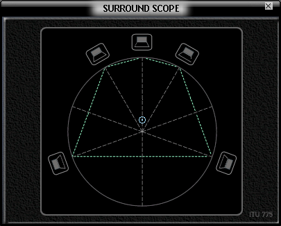At the left side above the surround meter, a circular arrangement of the five sound sources (speakers) can be found. This arrangement does not comply with the arrangement of the famous (and dreaded) ITU-